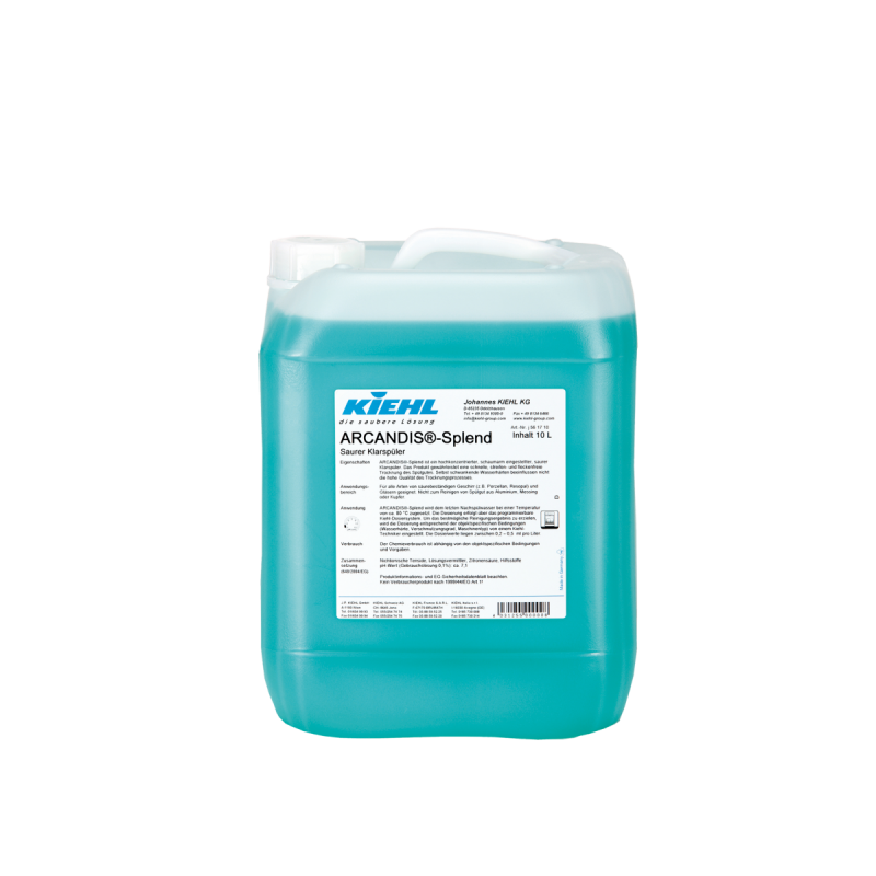 ARCANDIS®-Splend jest wysokoskoncentrowanym, kwaśnym środkiem do płukania naczyń w zmywarkach przemysłowych. Produkt zapewnia szybkie, wolne od smug i zacieków wysychanie naczyń, a tym samym gwarantuje optymalny proces mycia naczyń w zmywarce. Wysoką jakość procesu wysychania zapewniają specjalne surowce wiążące wapń- jakość ta pozostaje niezmienna niezależnie od twardości wody. Niskopieniąca formuła ARCANDIS®-Splend wspiera proces mycia pozostawiając naczynia czyste i błyszczące.