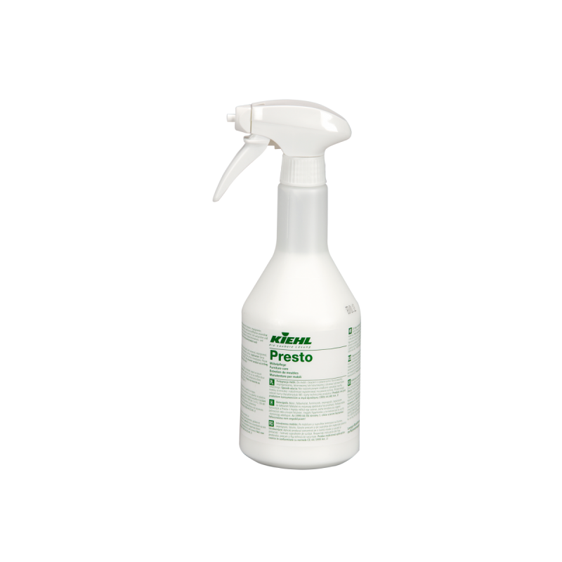 Presto jest czyszcząco- pielęgnacyjną emulsją olejowo-woskową, która pozostawia na powierzchni błyszczący film pielęgnujący. Presto usuwa plamy po alkoholu i wodzie oraz odciski palców i inne zabrudzenia. Po zastosowaniu środka lekkie uszkodzenia powierzchni stają się w dużym stopniu niewidoczne.