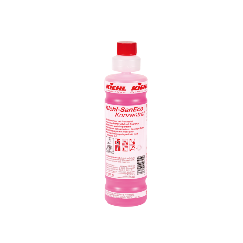 Aktywny, szybko działający produkt do mycia bieżącego sanitariatów o długotrwałym, świeżym zapachu. Przeznaczony do szybkiego usuwania pozostałości wapiennych i związanych w nich zabrudzeń. Efekt perlenia skutecznie zapobiega zbieraniu się wapna na wyczyszczonej powierzchni a nowa kombinacja kwasu gwarantuje wspaniały efekt czyszczenia. Dzięki formule przyjaznej dla środowiska naturalnego Kiehl-SanEco Konzentrat został oznaczony ekologicznym oznakowaniem Eco-label*.
