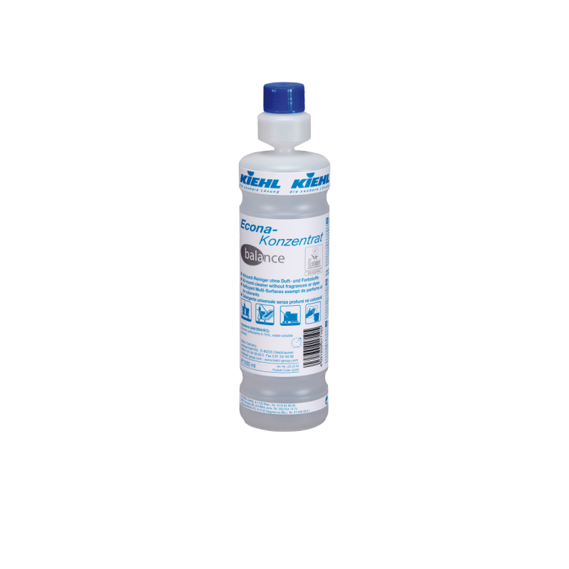 Econa-Konzentrat balance jest płynem w koncentracie do codziennego mycia bieżącego o uniwersalnym zastosowaniu. Dobry efekt skutecznego czyszczenia zostaje osiągnięty już przy zastosowaniu niskiego stężenia. Produkt czyści delikatnie powierzchnię, szybko wysycha bez smug i pozostawia naturalną optykę. Dzięki formule przyjaznej dla środowiska naturalnego Econa-Konzentrat Balance został oznaczony ekologicznym oznakowaniem Eco-label.